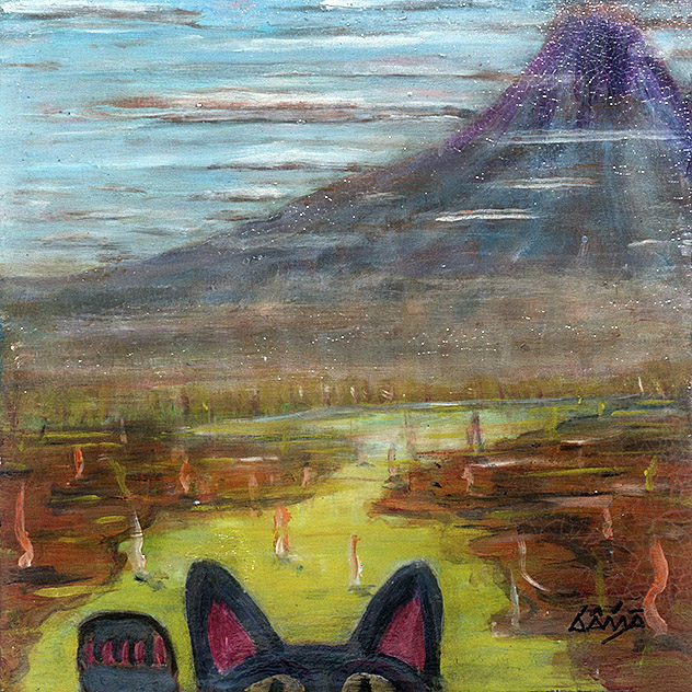 The other thing I keep learning the hard way, the back of a canvas can have as much of an effect of the painting as the front. I do like your sky and mountain however! Sheilathe painting is of a maneki neko and Mt. Fuji in the aftermath of the earthquake and tsunami that hit Fukushima, Japan in 2011.